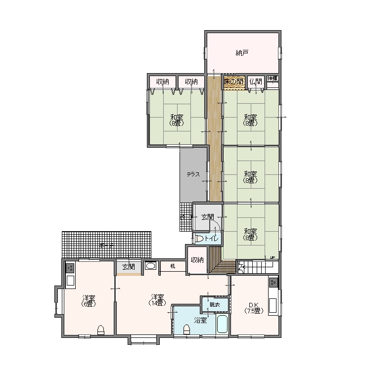 | 建物構造 | 木造・軽量鉄骨造2階建 | 間取り | 8DK+納戸 |
